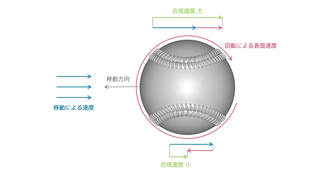 ストレートが投げられた時、ボールの表面には「移動による速度」と「回転による表面速度」の2つの速度が生じます。
