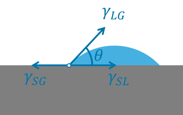 (静的)接触角\(\theta\)は、Youngの式によって、①固体-液体界面張力\(\gamma_{SL}\)、②固体-気体界面張力\(\gamma_{SG}\)、③気体-液体界面張力(表面張力)\(\gamma_{LG}\)と以下の関係が成り立ちます。