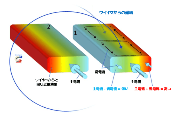 高周波では、交流電流によって1本の導体に発生する交流磁界が、隣接する導体に渦電流を誘導します。これにより、隣接する導体に面する側に電流が集中し、各導体内で電流分布が不均一になります。近接効果は、導体間の距離が表皮深さと同程度かそれより小さい場合に最も顕著になります。