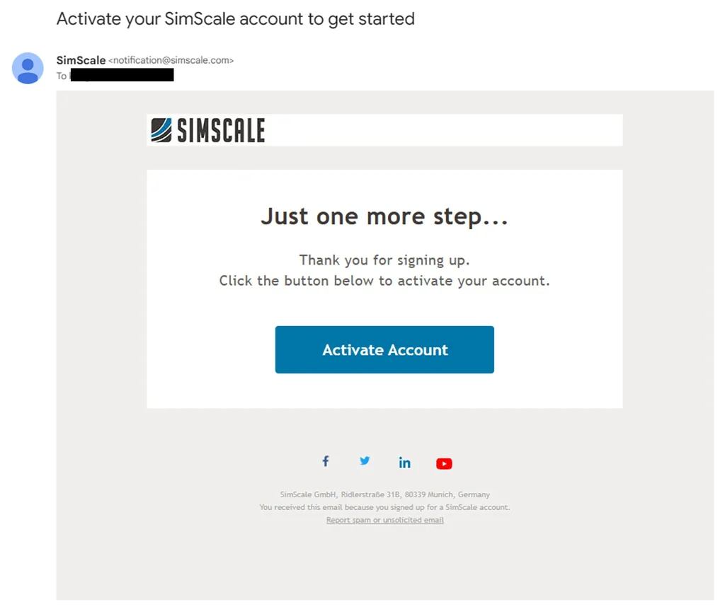 お申し込みいただいてから1〜2営業日以内に、SimScale社のアカウント発行担当より「Activate your SimScale account to get started」というタイトルのメールが送信されます。