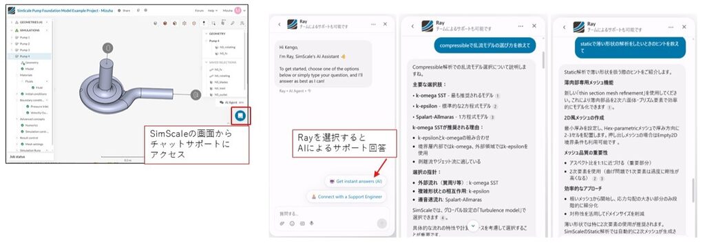 SimScaleの画面からアクセスできるチャットサポートに、AIサポート機能 「Ray」 が加わりました。