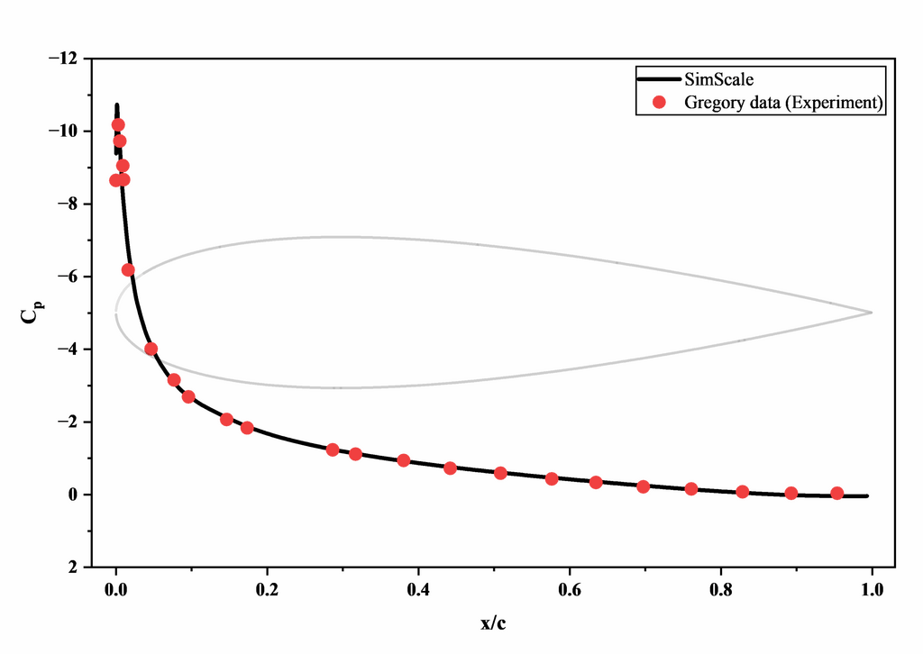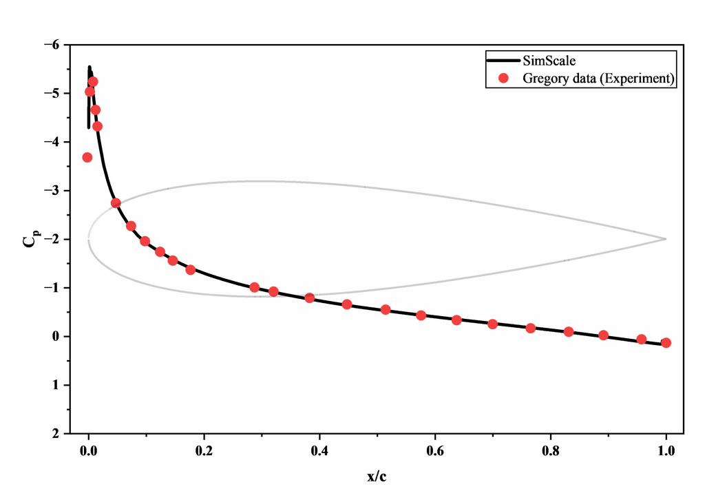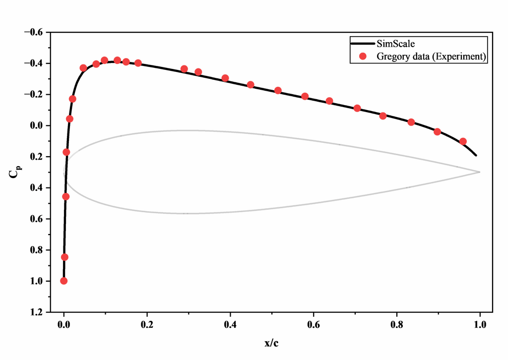 圧力係数は、空力挙動と翼の性能を評価する上で重要なパラメータです。以下の図は、翼上面の圧力係数について、シミュレーション結果と実験結果が良好な一致を示していることから、SimScaleがモデル上の圧力分布を高精度に予測していることを示しています。結果は、X座標を翼弦長で割った値でプロットされています。
