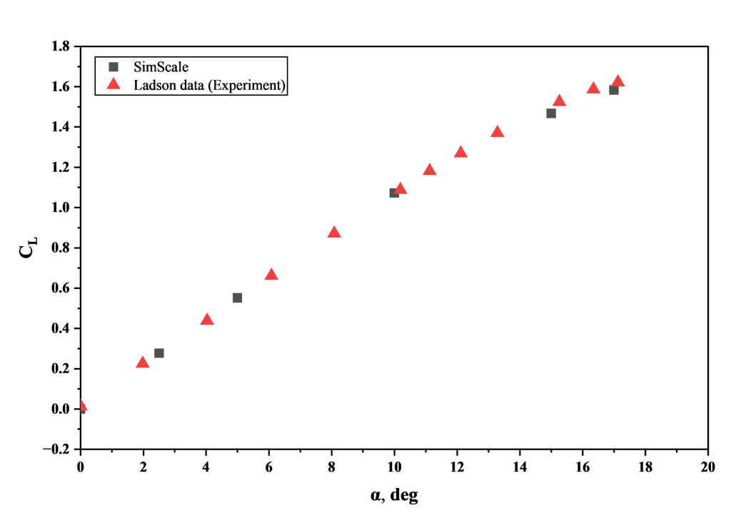 図 4 は、SimScale から得られた揚力係数の値を、対応する実験結果と比較して示しています。